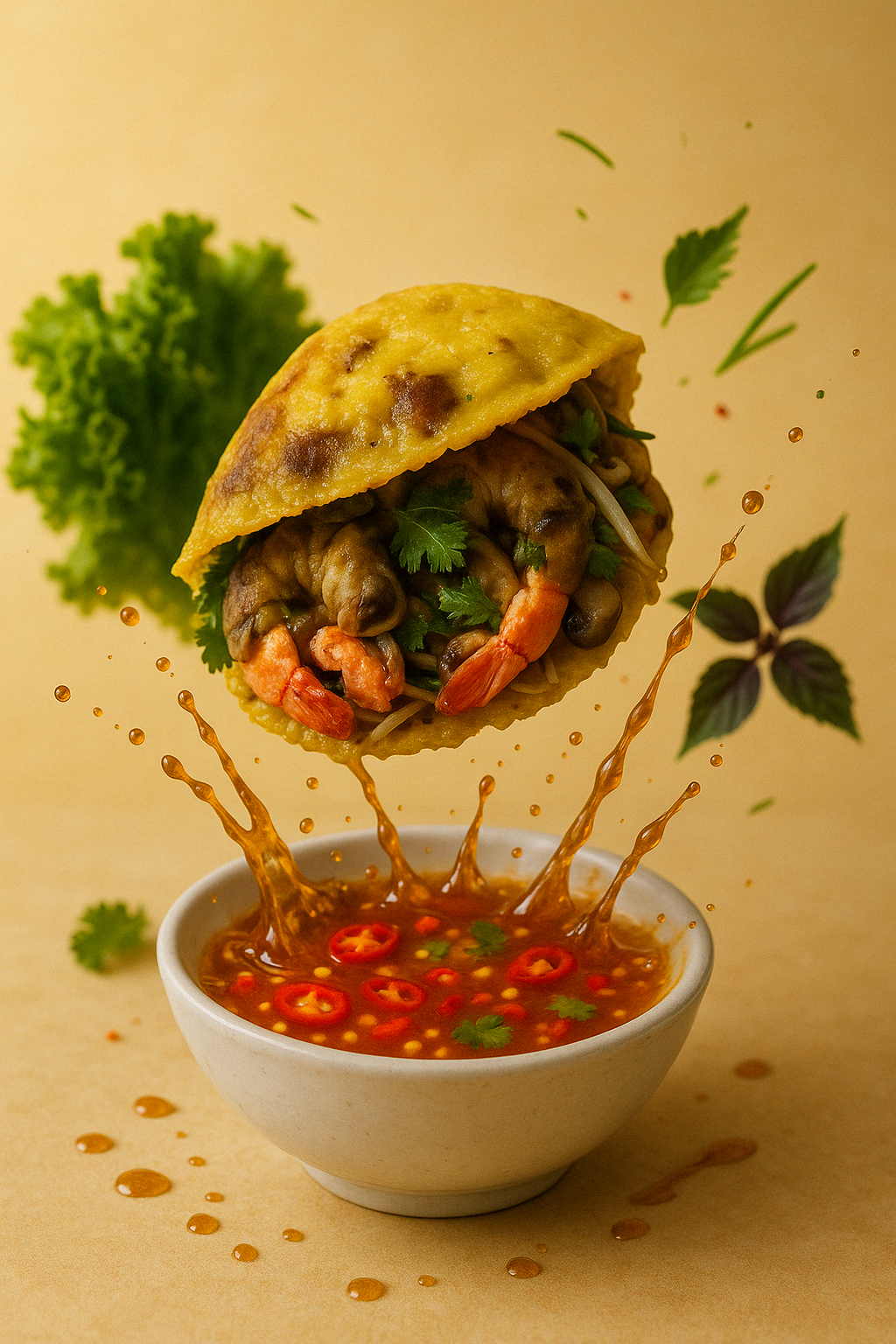 Continuez à utiliser la poêle profonde pour enrober les crêpes. Mettez la poêle sur la cuisinière, ajoutez un peu d'huile de cuisson pour l'enrober uniformément et à chaud, versez une cuillère à soupe de farine dans la poêle et enduisez-la uniformément. Ajoutez ensuite le mélange des crevettes, des viandes et des sojas sur le dessus, couvrez pendant environ 2 minutes jusqu'à ce que le gâteau soit cuit, croustillant, puis sortez-le et doublez le gâteau, servez avec des légumes verts et un bol de sauce de poisson au piment et à l'ail.