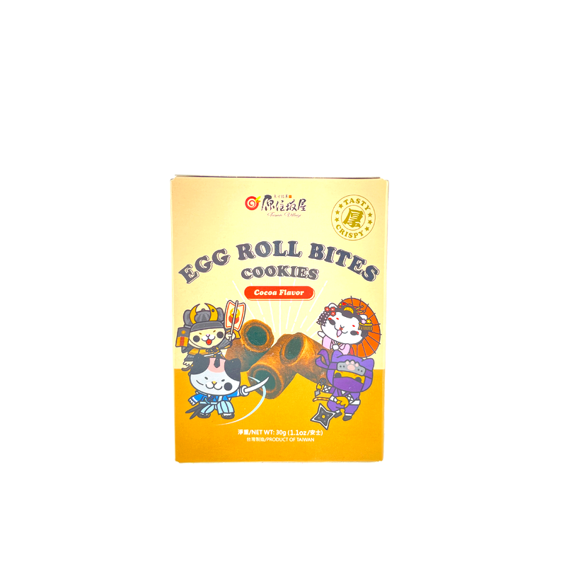 Ingrédients: œuf, farine de blé, sucre cassonade, shortening (huile de palme, emulsifiant: E471, lécithine de soja, arôme artificiel, antioxydants: E306, colorant: E160A), poudre de cacao. Contient Petits rouleaux croustillants à base d'œufs et de cacao, au goût délicatement sucré et à la texture légère. Format pratique pour une pause gourmande. Présentation ludique avec des personnages mignons, idéale pour les enfants ou pour offrir. Produit original de Taïwan.: blé, œuf, soja produit; Valeurs nutritionnelles pour 100g: Energie: 1681KJ/403kcal; Matières Graisses: 23,8g dont gras saturés: 11,6g; Glucides: 41g dont sucres: 20g; Protéines: 6,4g; Sel: 0,110g. Produit de Taiwan